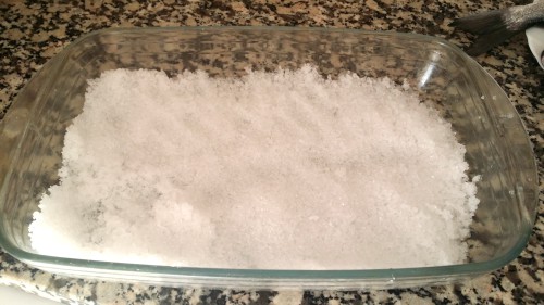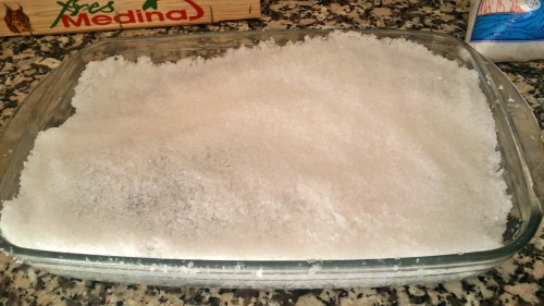 Cubre el pescado con aceite, coloca en el lecho de sal y cubre con la sal restante.