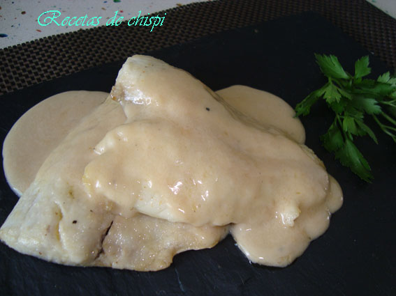 Para hacer la salsa poner en una sarten la mantequilla y la harina, dejar freir unos segundos y añadir el vino y dejar reducir un poco, agregar la nata (crema de leche) y la sal al gusto, dejar cocer unos minutos a fuego suave, añadir el perejil picado.