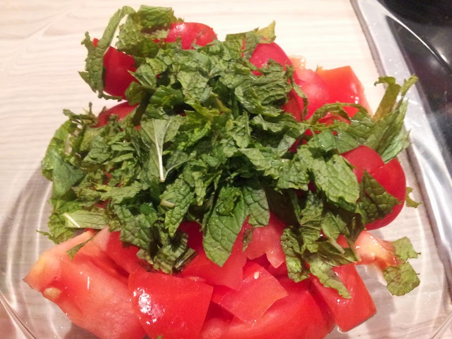 3. En un bol echamos los tomates y un buen manojo de hierbabuena picada. Añadimos sal, la ralladura de limón y el jugo y aceite de Oliva. Mezclamos y reservamos.