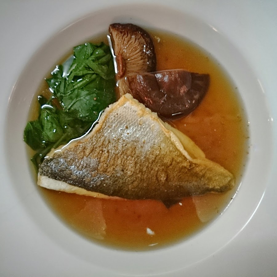 Emplatamos en uno hondo con el caldo como base, la mitad de las espinacas apiñadas y una seta cortada. Añadimos el filete de dorada y espolvoreamos con un poco de siete especias japonesas. Servimos caliente.