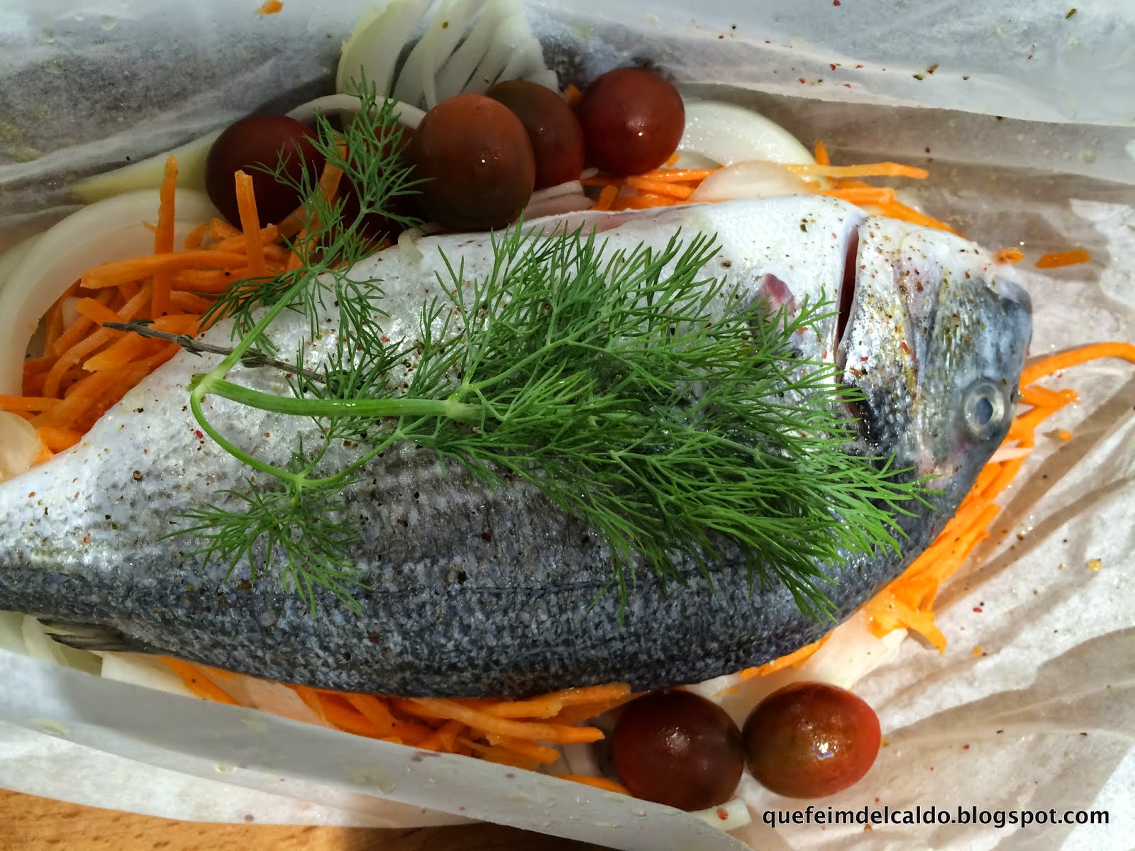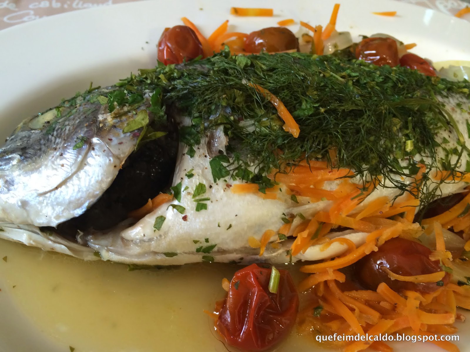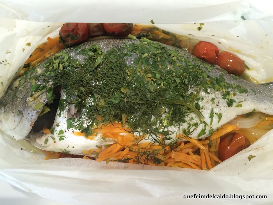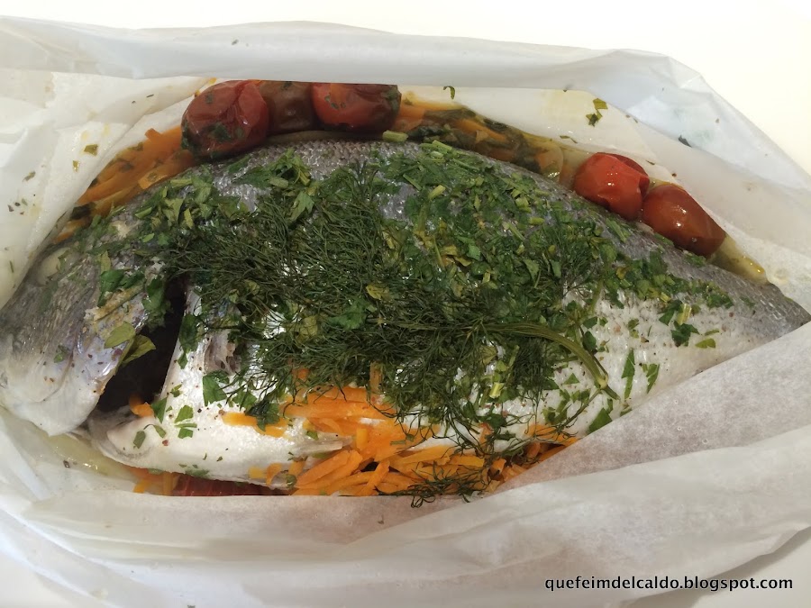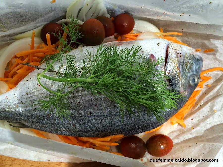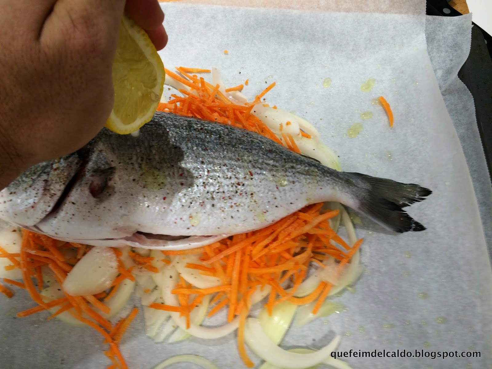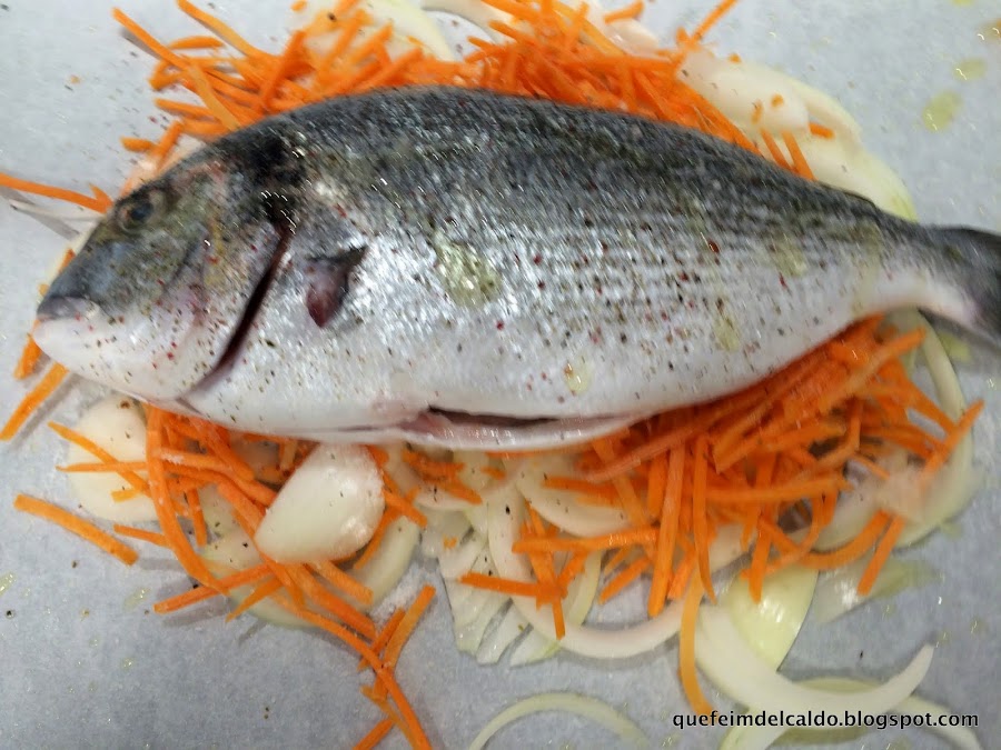 Sobre la cama de cebolla y zanahoria colocamos la dorada que habremos salpimentado.