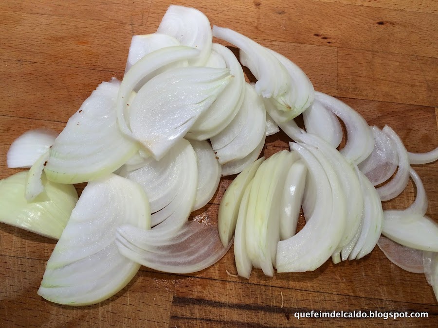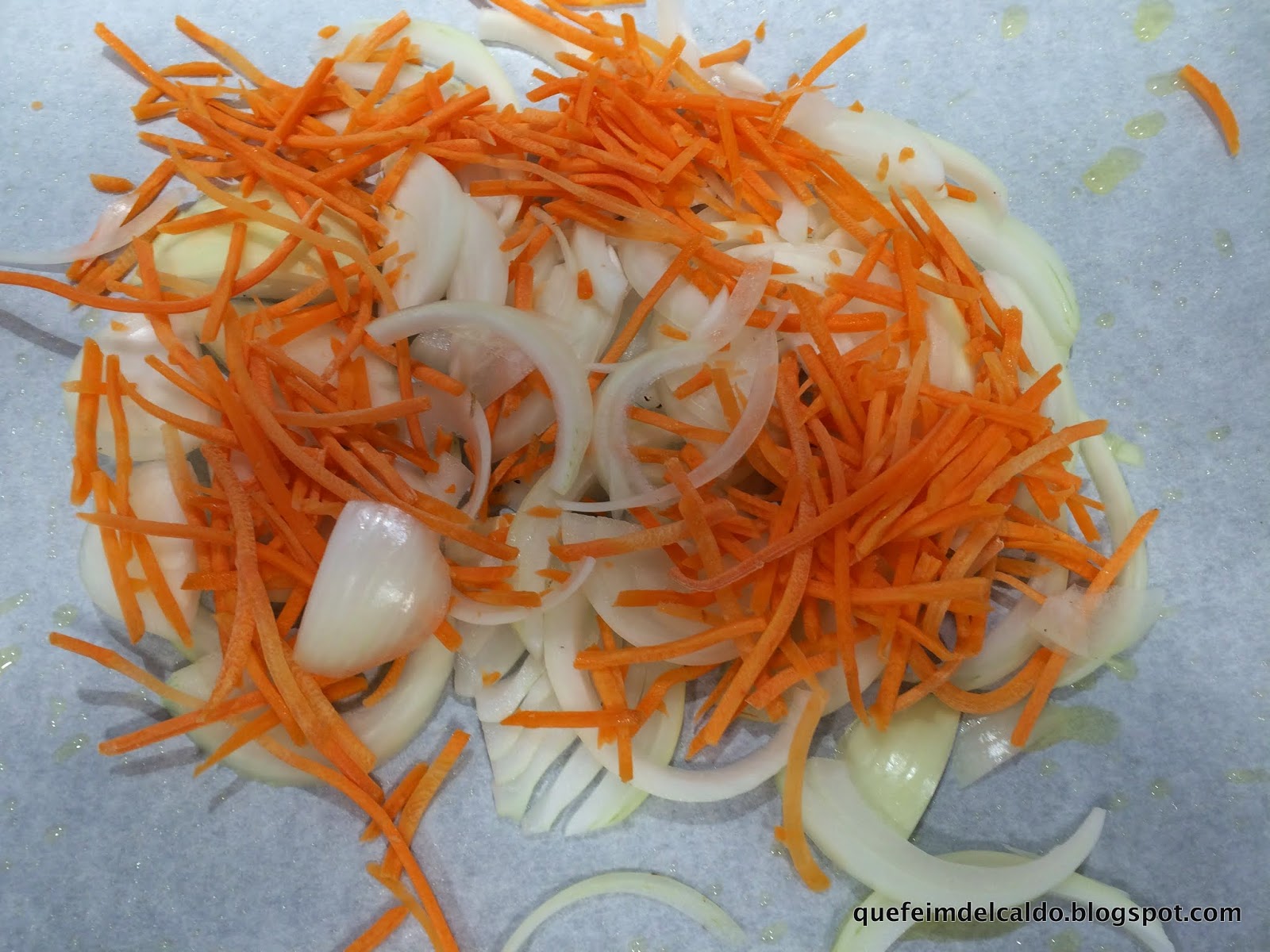 Sobre el papel sulfurizado ponemos media cebolla cortada en juliana y media zanahoria.