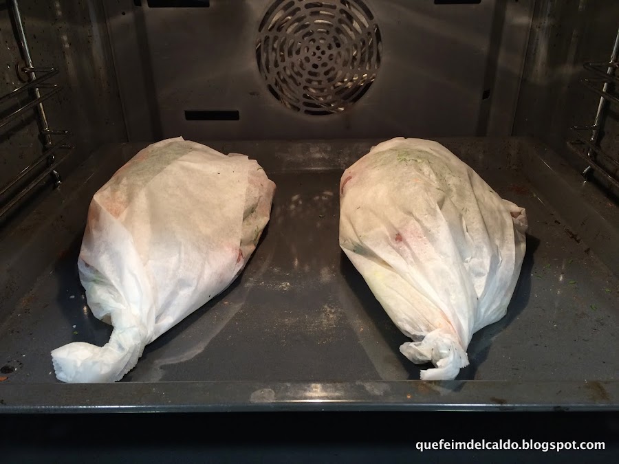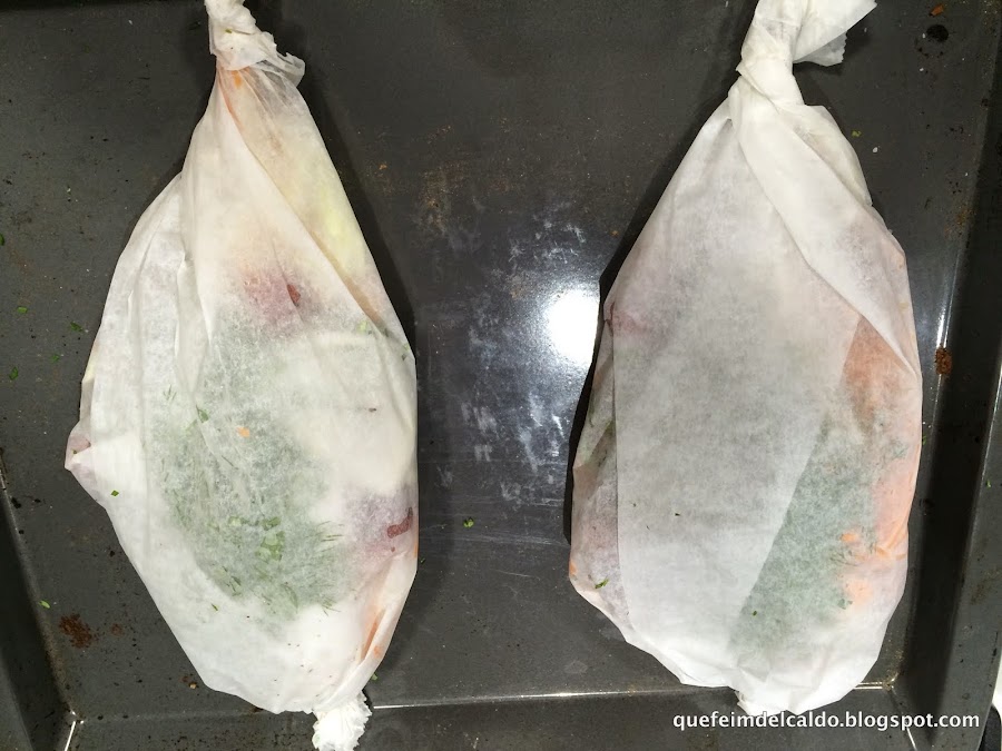 Envolvemos las doradas como si fueran caramelos asegurándonos que no se abre, así evitamos que se escape el vapor y el líquido de cocción.
