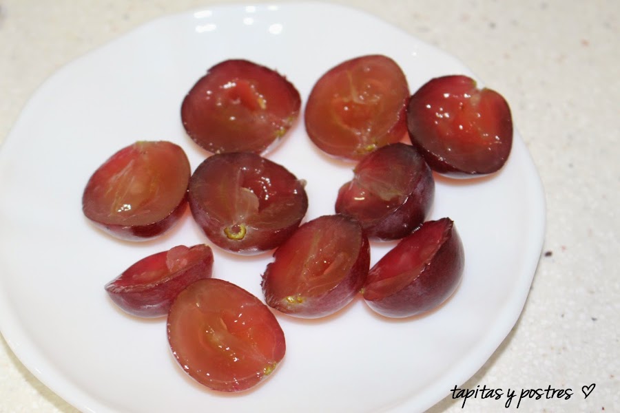 Lavamos bien las uvas y las partimos por la mitad, quitando las semillas.