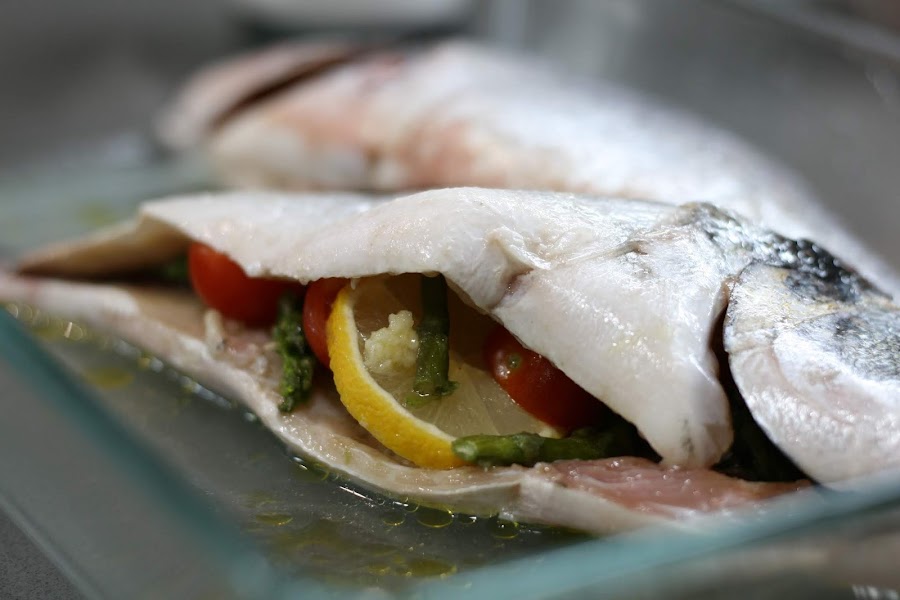 Ponemos las doradas de lado, como se ve en la foto y las rellenamos cada una con la mitad de los tomates, espárragos y limón.