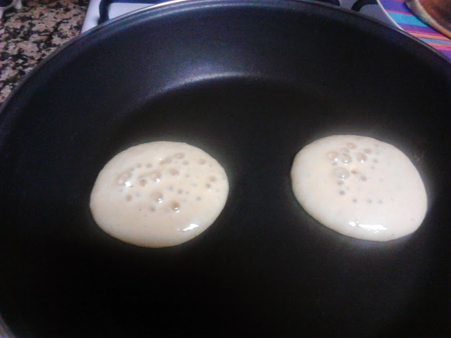 Pasado este tiempo, preparamos una sarten antihaderente y la ponemos al fuego. y con una cuchara vamos poniendo la masa pero no pasa nada si al caer en la sarten no es circulo perfecto, la masa poco a poco se va haciendo circulo perfecto a medida que se caliente.