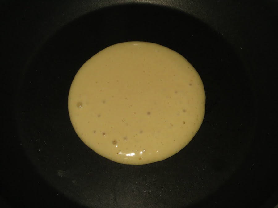 Sacamos la mezcla y la dejamos reposar durante 30 minutos. Luego cogemos una sartén antiadherente y echamos un par de cucharada de masa, la dejamos hasta que burbujee como si fueran tortitas y le damos la vuelta. Sacamos y reservamos.