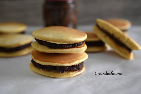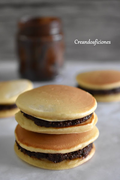 Hoy preparamos estos ricos dorayakis rellenos de crema de avellanas sin azúcar. Con los ingredientes de esta receta salen unos 9 dorayakis ya montados. Empezamos.