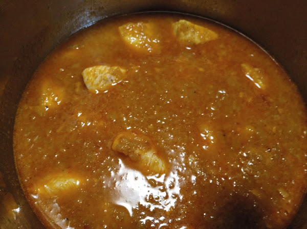 No me gusta hacer los asados en la thermomix, pues me parece que deshace mucho la carne, así que ya continué en la cazuela. Así que una vez tengamos el sofrito listo en la pota, añadimos 50 ml de vino blanco, 1 cucharada de té de miel y 125 ml de caldo de pollo.