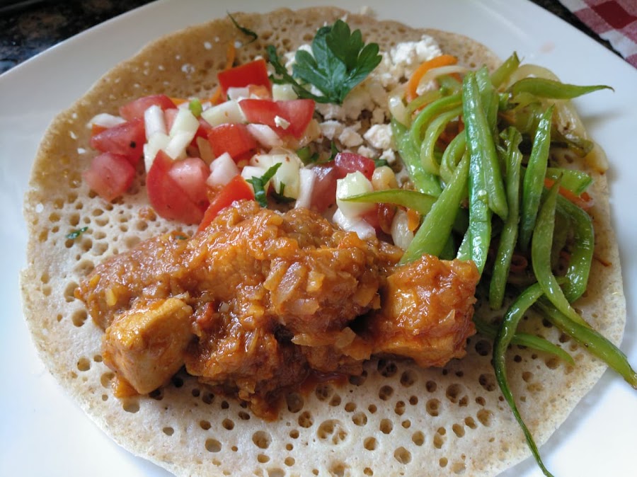 Hemos comido el doro wat con pan injera, ensalada etíope, fasolia y queso.