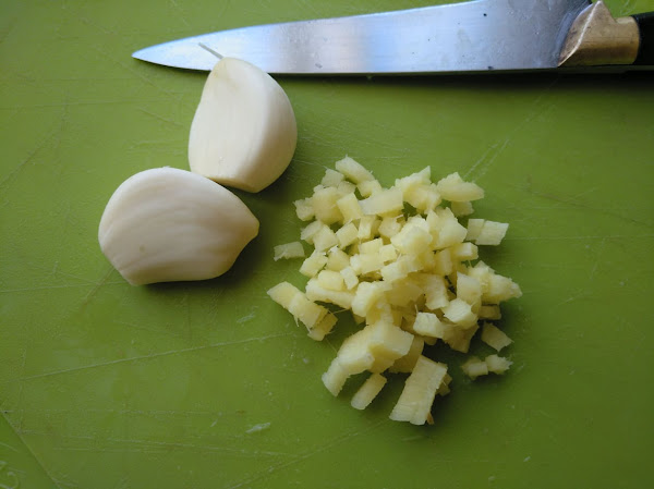 Trascurrida la media hora, añadimos a la cazuela o a la thermomix el ajo y el jengibre picados y las dos cucharadas de especias berbere.