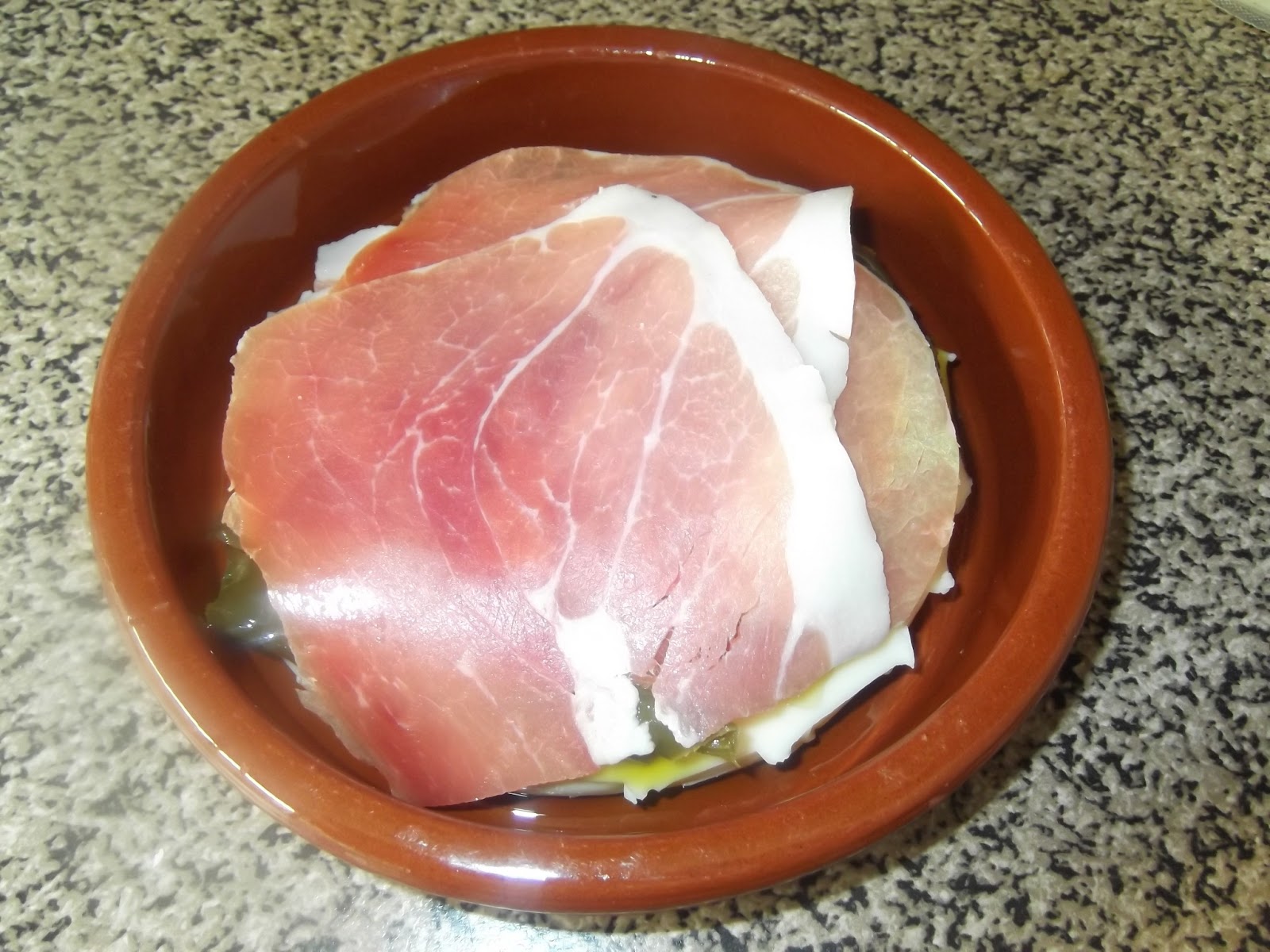 El siguiente paso es colocar las lonchas de jamón serrano y tapar con el otro trozo de queso. Espolvorear un poco de orégano por encima o la especia que más os guste. Ahora lo metemos al horno, que estará precalentado a 200º, unos 15 minutos o hasta que veáis que la parte de arriba está dorada, y ya está listo para comer.