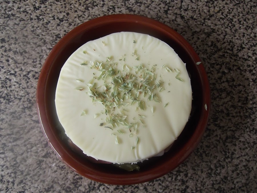 Lo primero que hacemos es coger una fuente redonda apta para horno, hay colocamos una de las mitades del queso, yo compre dos de