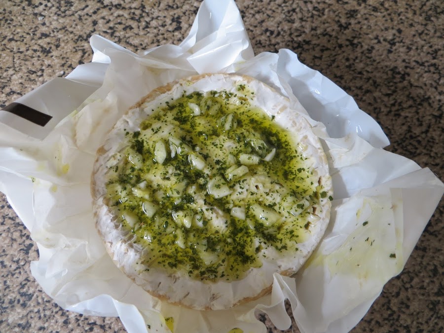 Abrimos la caja que contiene el queso y pinchamos la corteza con un tenedor. A continuación, comenzamos a realizar el majado con los dos dientes de ajo picados finamente, el perejil y le añadimos el aceite. Lo machacamos todo y cubrimos la parte de arriba del queso. Lo volvemos a tapar con el papel y lo dejamos así cinco minutos para que todos los sabores vayan penetrando en el queso.