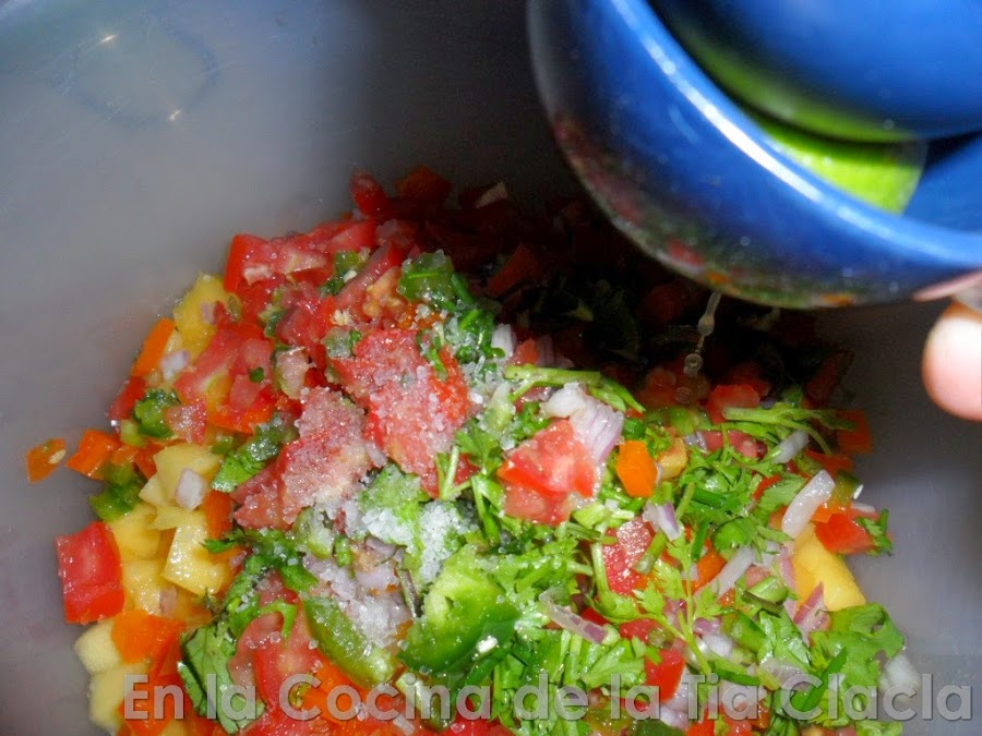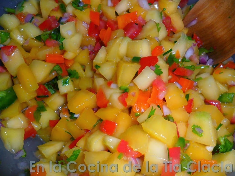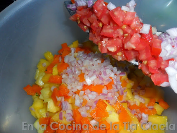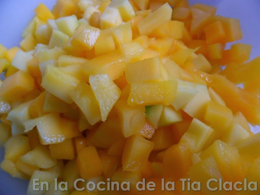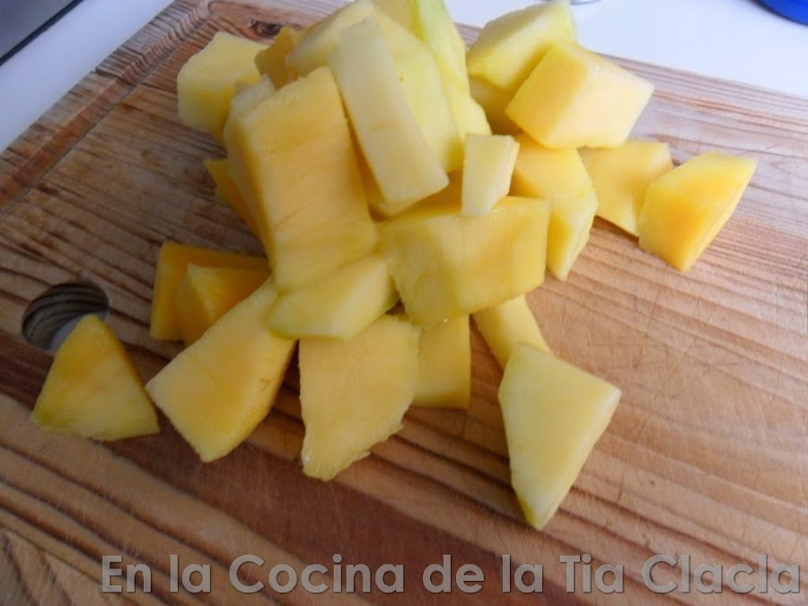 1. Pele los mangos y pártalos en cuadritos pequeños como de 1 centímetro