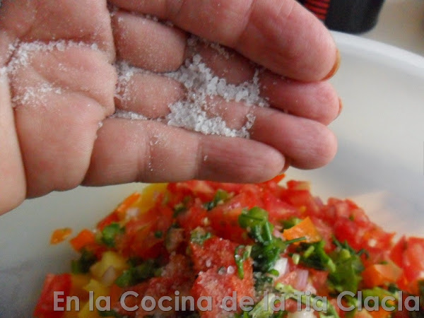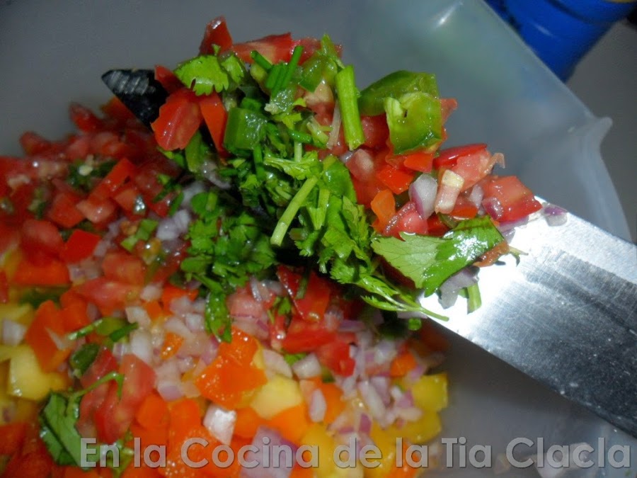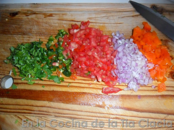 2. Pique finamente, el pimentón, la cebolla, el tomate, el chile o ají, el cilantro y el ciboulette.