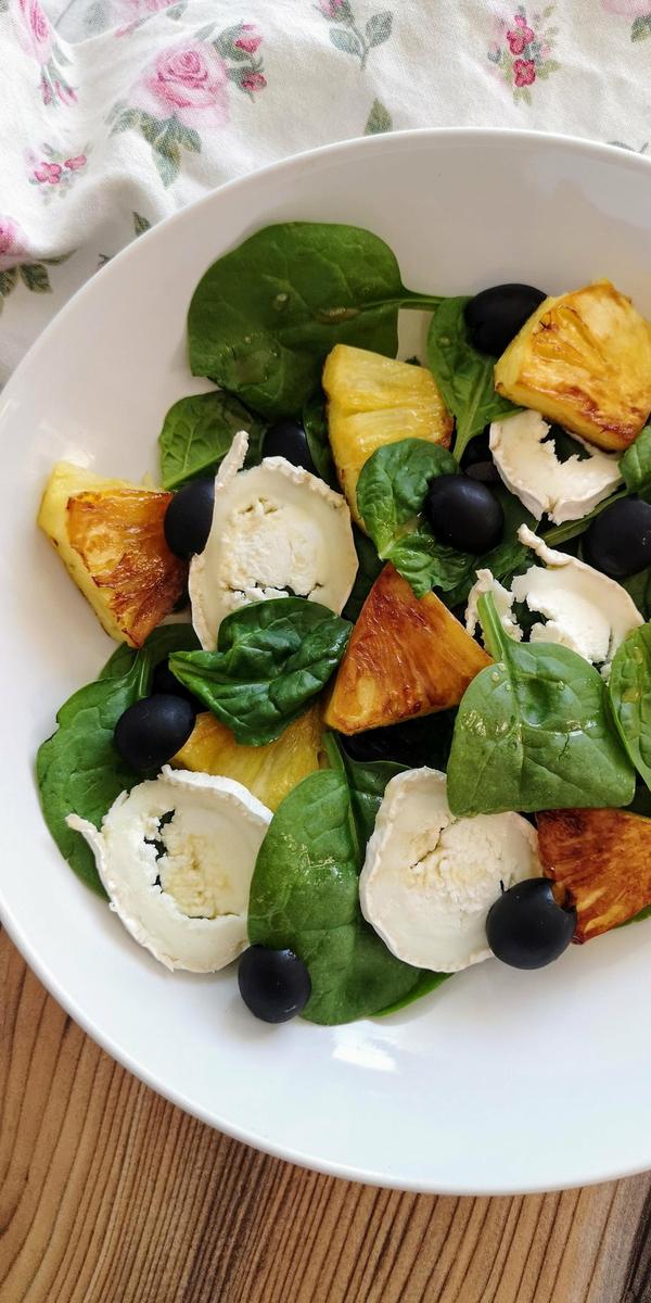 –Para preparar la vinagreta: mezcla 1 cucharada de miel + 30 ml de AOVE + 2 cucharadas de vinagre de vino blanco + un chorrito de zumo de limón + un poco del jugo de la propia piña + una pizca de sal.-Para asar la piña: retira la piel, córtala en trozos y dórala en una sartén a fuego fuerte sin aceite. Vuelta y vuelta.