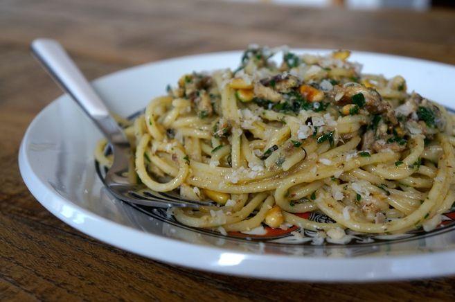 Drenamos las sardinas, cortamos en dos y añadimos con la cebolla en la sartén. Revolvemos suavemente para integrar todo y finalmente añadimos un poco de aceite de oliva y los espaguetis. Un sabor fuerte y distinto para los espaguetis de siempre.