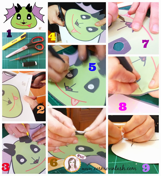 por donde pasaremos la goma elástica, hacemos un nudo a la goma en ambos extremos para que no se suelte y... VOILÀ!! ya está hecha la careta ^_^
