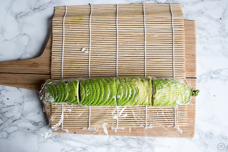 - Volvemos a cubrir el rollo con el papel film con cuidado, y después con la esterilla. Volvemos a presionar como si estuviésemos formando el rollo. De esta manera, el aguacate se quedará "pegado" al rollo. Tenemos que hacerlo con cuidado de que no se nos deslice y se descentre.