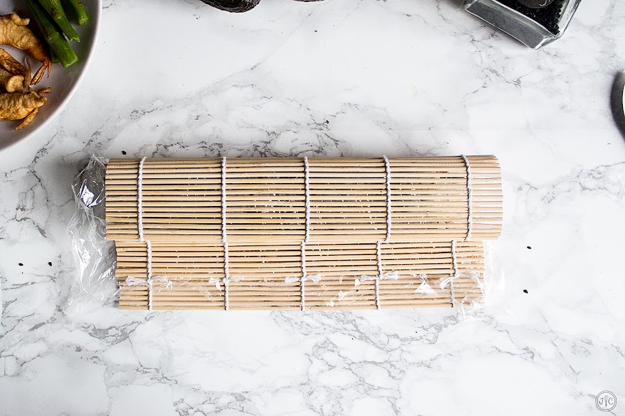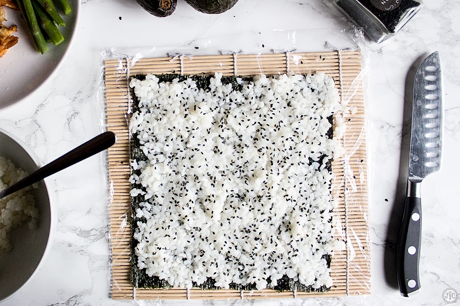 - Estamos haciendo uramakis, es decir, que el arroz va por fuera, así que le damos la vuelta sobre la esterilla, de modo que ahora el arroz está en contacto con el papel film.