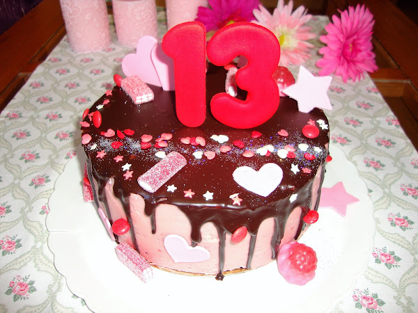 La cobertura es buttercream de frambuesa y está coronada por ganache de chocolate negro.