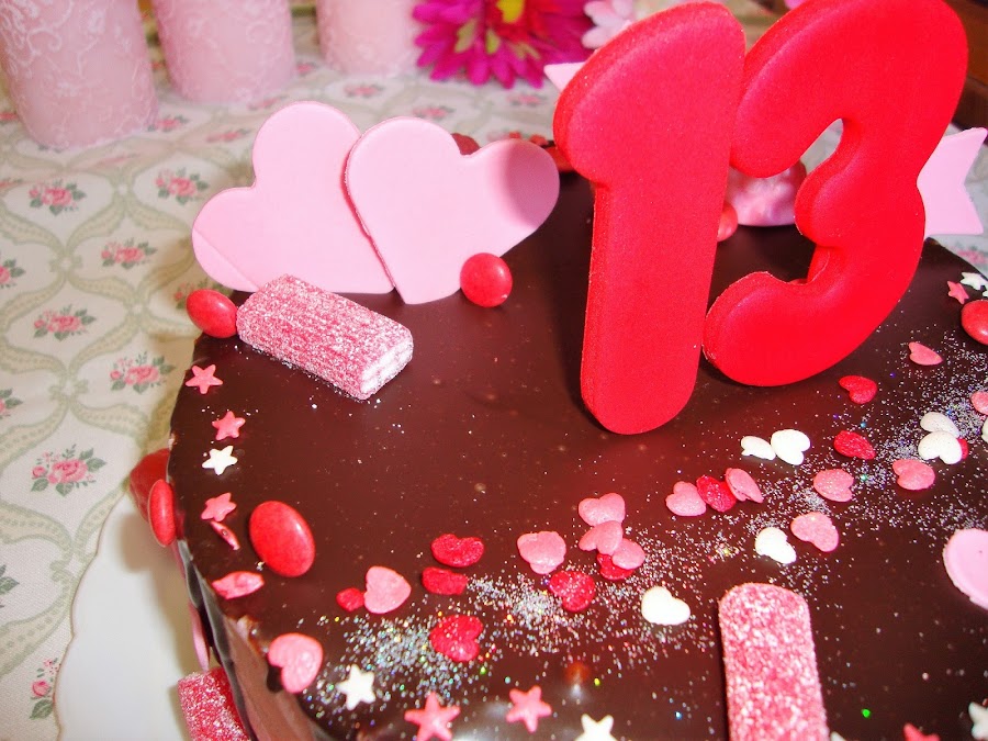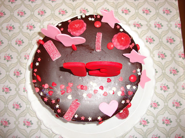 La decoración está realizada con fondant, chuches, decoraciones de azúcar y purpurina comestible.