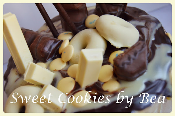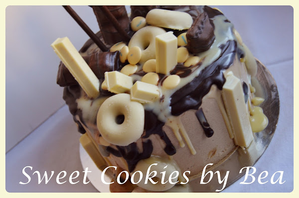 Una vez fríos ponemos encima de nuestra tarta dejando que caigan los goterones, ponemos encima todo tipo de chocolatina y galletas que apetezca.