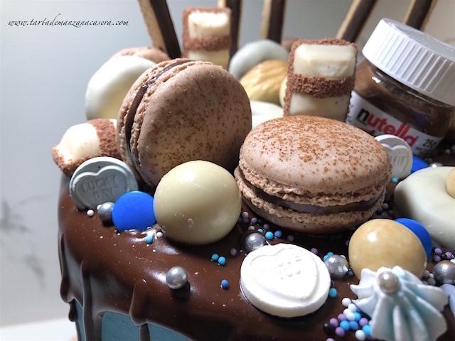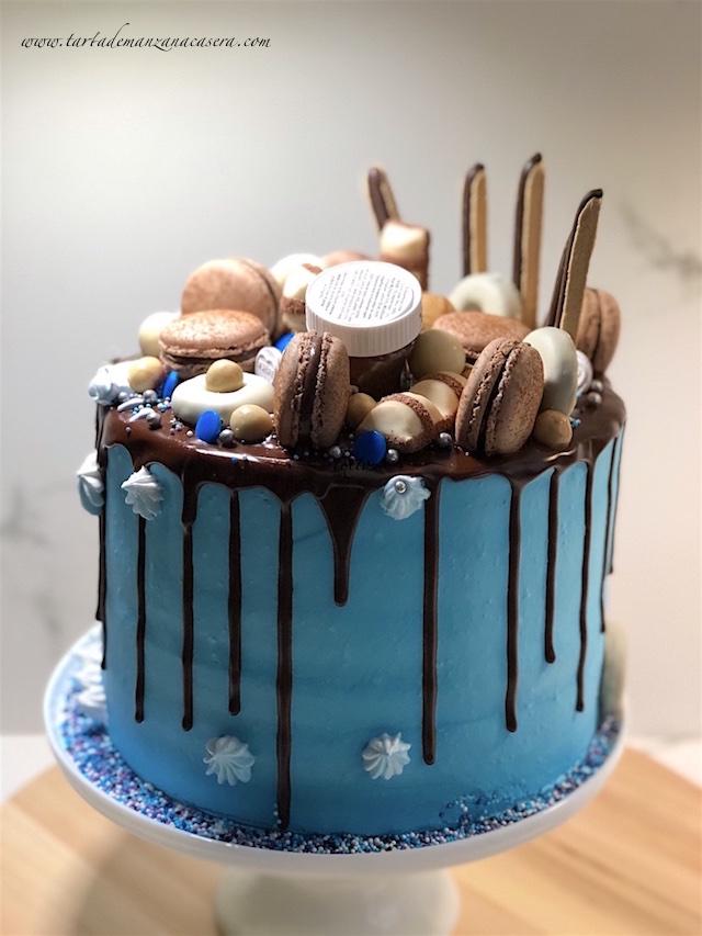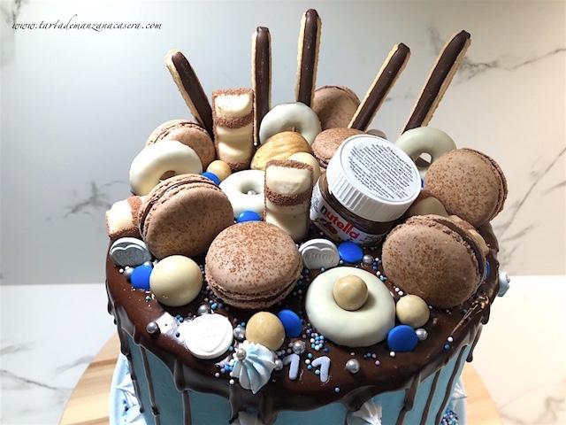 Lucía tenía claro cómo quería su tarta, una Drip Cake e color azul, con chorros de chocolate, sprinkles, perlas, bolas de chocolate, palitos de chocolate, macarons, Filipinos, bombones y hasta un mini tarro de Nutella, un sinfín de dulces ordenadamente desordenados.