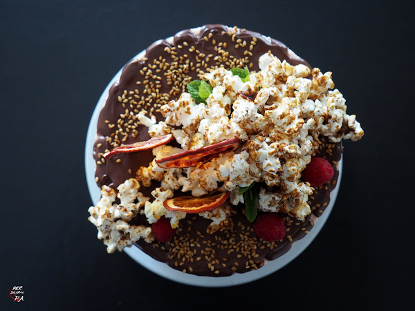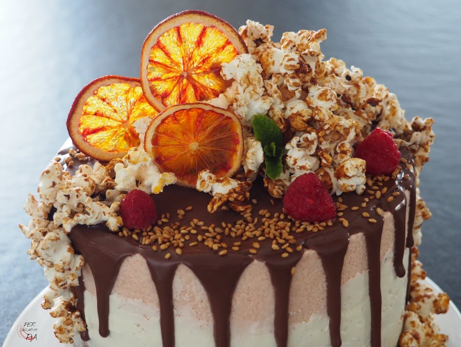 Dada la envergadura que tienen hemos optado por aligerarla un poco utilizando mousses (naranja sanguina y chocolate negro) sobre una base de bizcocho de chocolate en su preparación, y una etérea decoración a base de palomitas de maíz con caramelo salado. Los churretes, por supuesto, de chocolate negro.