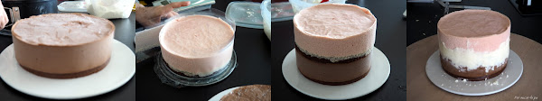 Colocar como base de la tarta la mitad de bizcocho y mousse de chocolate y encima la de bizcocho y mousse de naranja. Tapar la unión de las dos piezas con un poco de nata montada (crema de leche) y alisar con una espátula. Unifica la tarta y le da un aire decorativo.