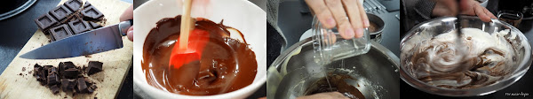 Poner en un bol el chocolate fundido y añadir la pasta bomba, mezclar e incorporar la gelatina fundida. Por último añadir la nata (crema de leche) semi-montada, y mezclar suavemente para que no se nos baje y mantenga la esponjosidad.