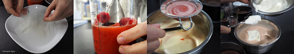 En un cazo poner el azúcar y el agua y cocer hasta alcanzar los 121ºC. Con las varillas en velocidad media-baja añadir el azúcar caliente a las yemas, dejando resbalar un hilo por la pared interior del bol. Cuando esté todo incorporado subir la velocidad y batir hasta que se enfríe. La masa tendrá un color pálido y habrá aumentado de volumen. Ya está lista la pasta bomba, dividirla en dos partes una para cada mousse.