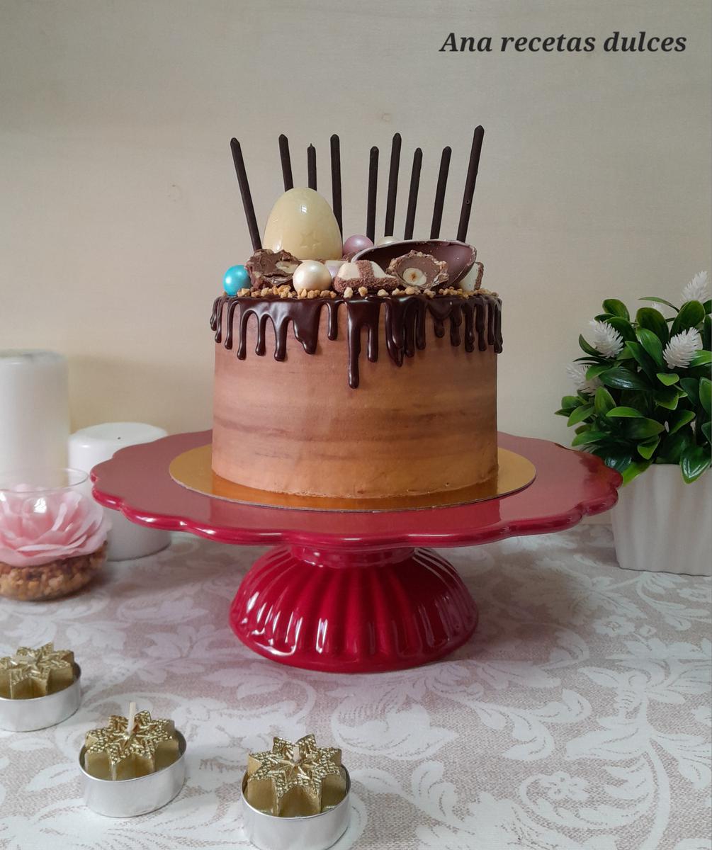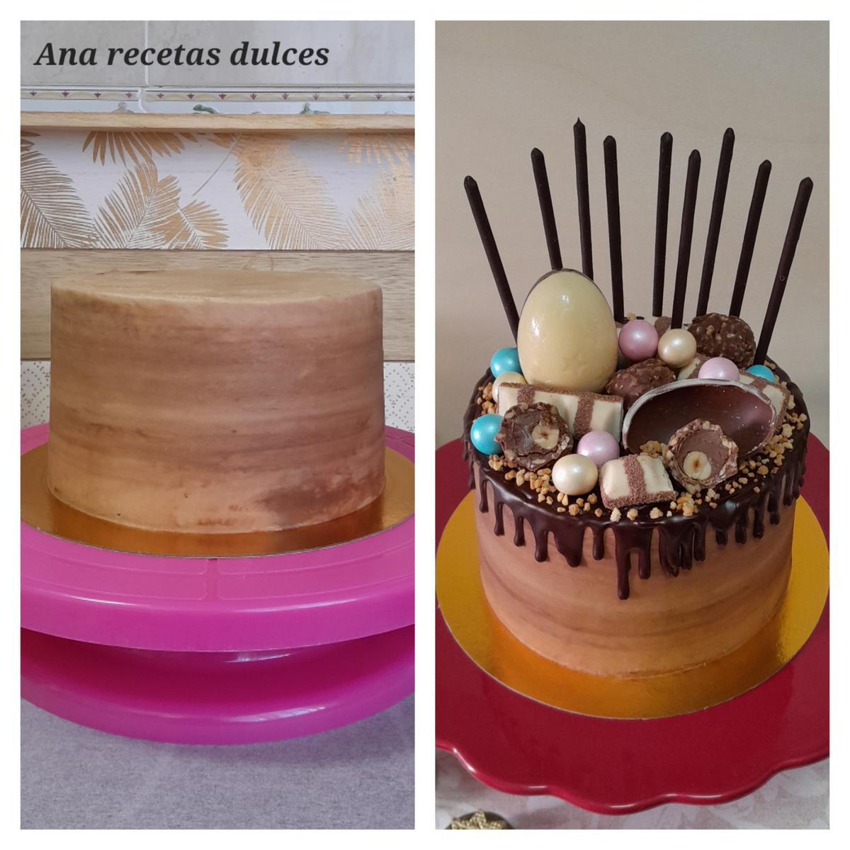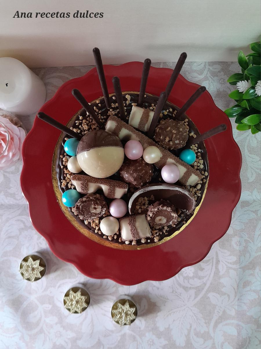 Por último decoramos a nuestro gusto con huevos kinder, kinder bueno, mikado, bombones ferrero rocher, almendras crocanti y las bolitas de chocolate de colores.