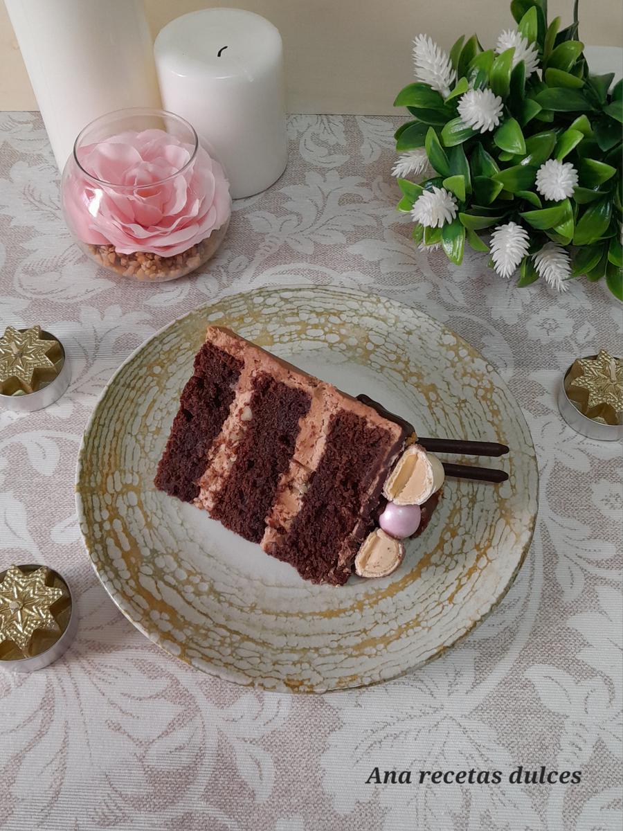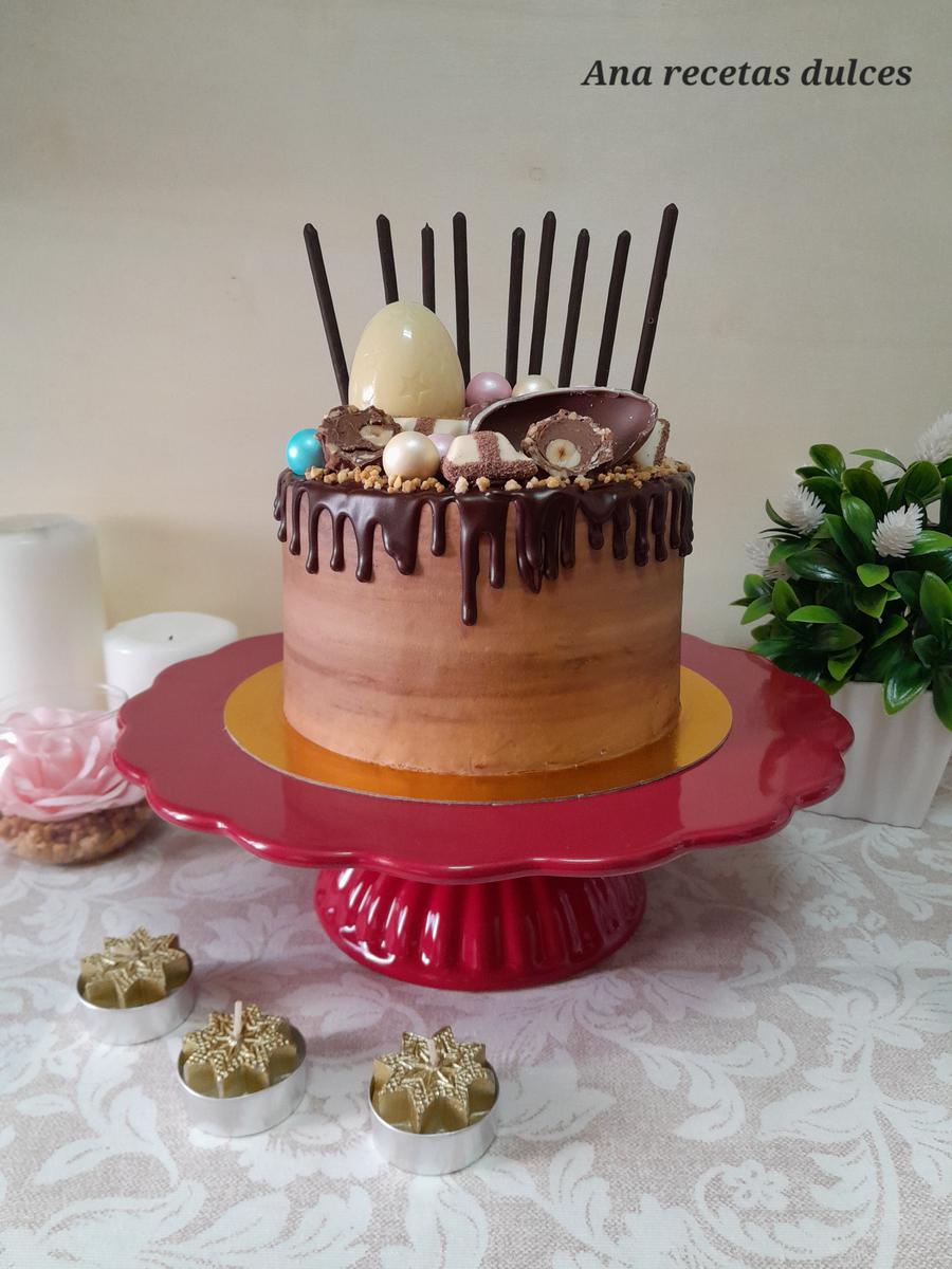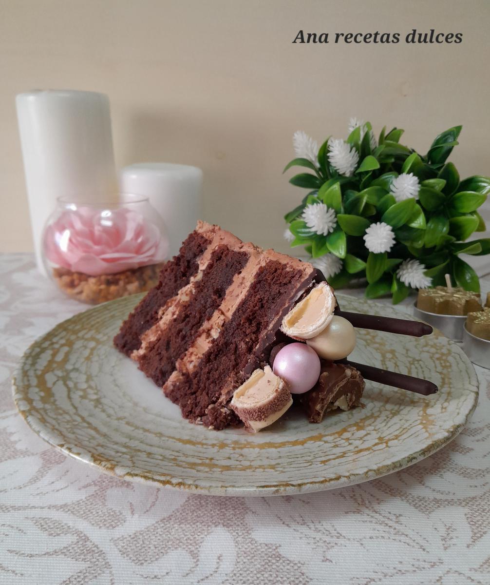 Por último decoramos a nuestro gusto con huevos kinder, kinder bueno, mikado, bombones ferrero rocher, almendras crocanti y las bolitas de chocolate de colores.