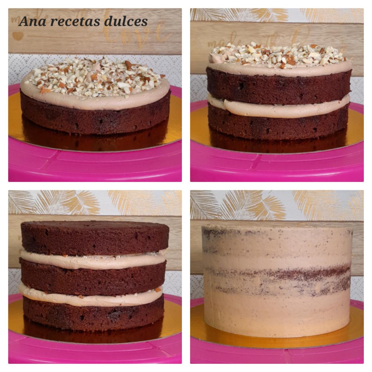 Ponemos el primer bizcocho en el plato o stand donde lo vamos a servir, ponemos una capa generosa de buttercream y repartimos de forma uniforme por toda la superficie del bizcocho (yo la he repartido con una manga pastelera), esparcimos por encima la mitad de las avellanas troceadas.