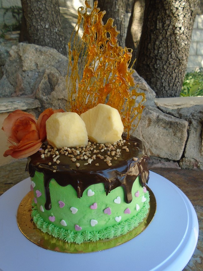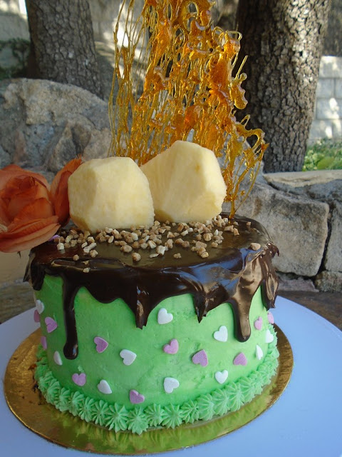 Se trata del Drip Cake, una tarta o pastel que va cubierto con una ganache chorreando o goteando, estas gotas no se dejan caer hasta abajo del pastel y la decoración con lo que tengamos por casa, frutas, galletas incluso las podemos decorar con flores, yo me he decidido por hacer una decoración con caramelo, almendras crocanti, manzanas y unos corazoncillos, pero eso como más os guste. Este estilo de decoración de pasteles, fue impulsado en el 2015 por Katherine Sabbath.