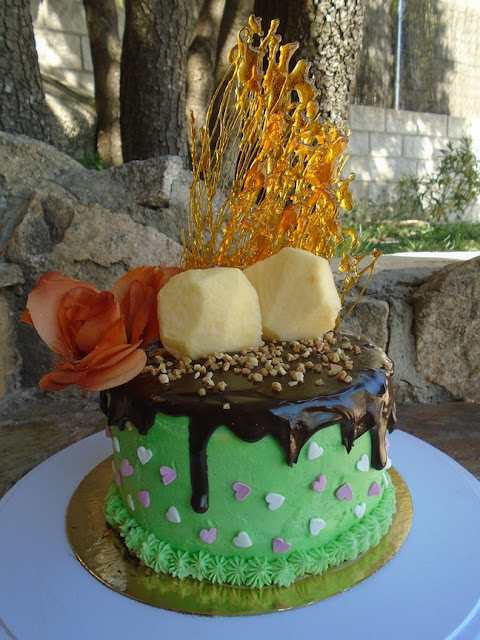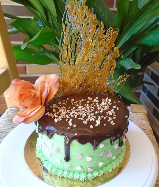 No dejéis que se enfrié demasiado el ganache, por que se queda muy espeso, es lo que me paso a mi, quise controlar los chorritos para que no bajasen demasiado por las paredes de la tarta, pero bueno para ser la primera vez, estoy satisfecha con el resultado.
