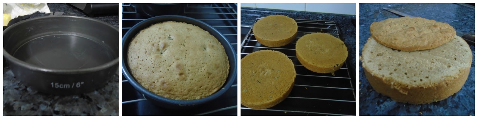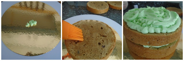 Humedecemos con almíbar el primer bizcocho, de esta manera se nos quedara más jugoso el bizcocho por más tiempo, hecho esto ponemos el relleno del primer bizcocho, ponemos el siguiente bizcocho y repetimos el proceso de antes, almibaremos y rellenamos con la butercream, finalizamos el montaje poniendo el ultimo bizcocho boca abajo.