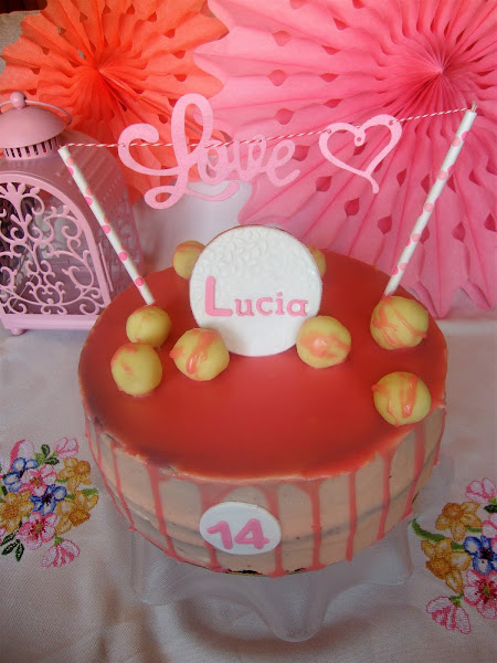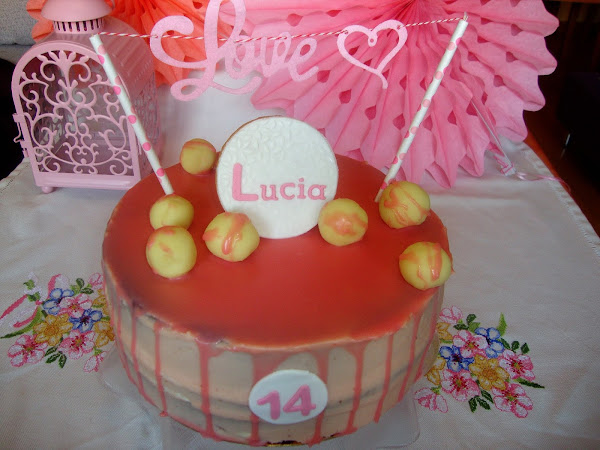 Esta cubierta por buttercream de fresa y bañada en ganache de chocolate blanco (teñido de rosa).