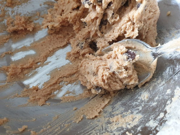 4. - Y por último, añadimos las pepitas de chocolate, ella le añadía también nueces pacanas picadas, pero yo las he omitido. Y mezclamos hasta que el chocolate esté bien repartido.
