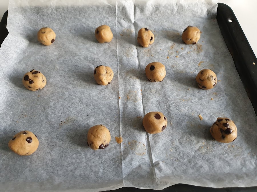 6. - Precalentamos el horno a 170º y cuando ya esté caliente, sacamos las bolitas de la nevera. Las colocamos en una fuente de horno con bastante separación, 12 por bandeja, para que no se peguen cuando se expandan, aunque a mi se me han pegado algunas.... Y horneamos de 15 a 18 minutos.