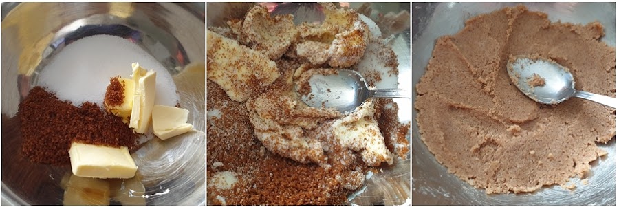 1. - Comenzamos poniendo en un bol la mantequilla con el azúcar normal y el azúcar moreno. Y con una espátula o una cuchara, vamos mezclando hasta que quede una pasta cremosa.