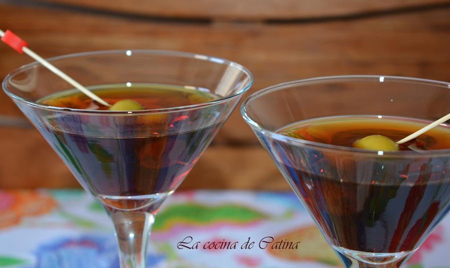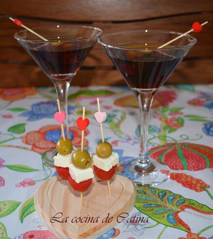 Vertemos en las copas y ponemos en cada una de ellas un pincho con una o dos aceitunas.
