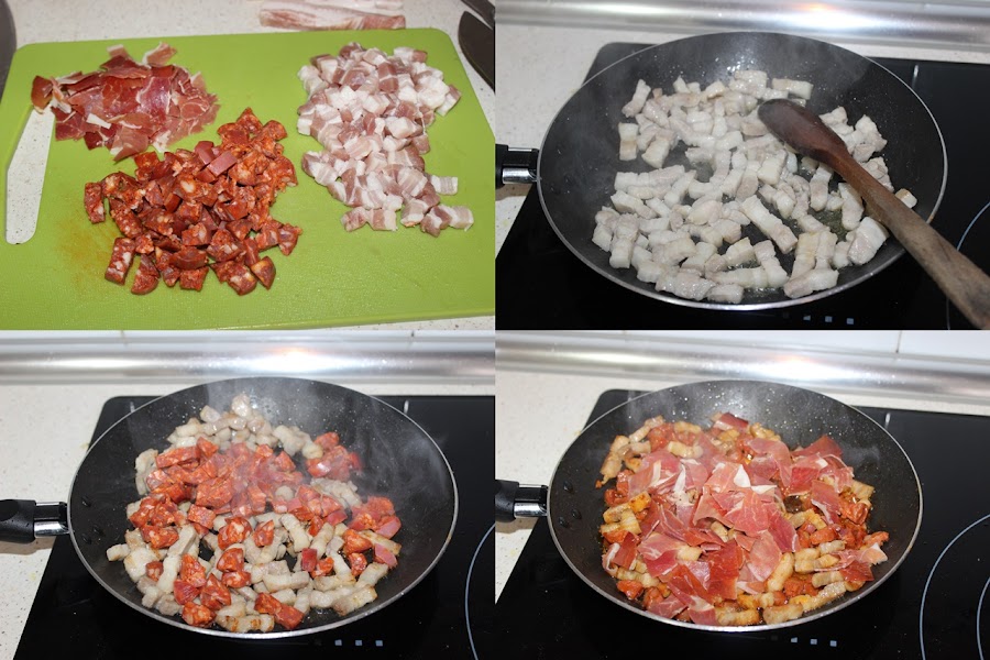Cortamos el jamón, el tocino y los chorizos en taquitos. Ponemos un poco, muy poco aceite en una sartén y sofreímos el tocino, cuando esté dorado añadimos el chorizo y lo freímos durante 1-2 minutos, añadimos el jamón y los sofreímos durante 1 minuto.