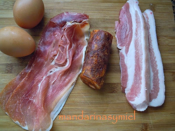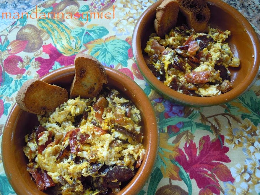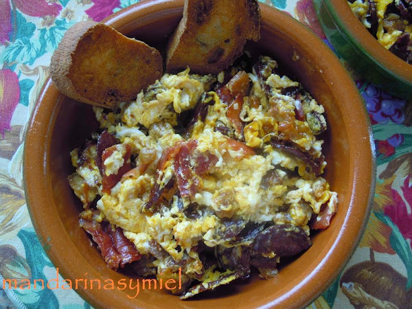 Los ingredientes principales son el huevo, chorizo y tocino, también hay quien le pone sesos, pero como no me gustan nada, les he puesto un poco de jamón.