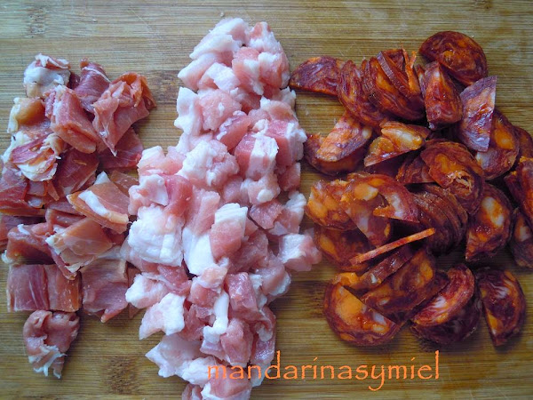 Corta en tiritas la panceta y el jamón, y el chorizo en medias rodajas.