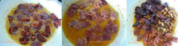 Pon el jamón en la misma sartén y sofríelo pero solo un poco para que no se queme.