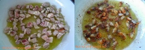 Pon una sartén con aceite al fuego, sofríe la panceta hasta que esté bien tostada, retira a un plato.