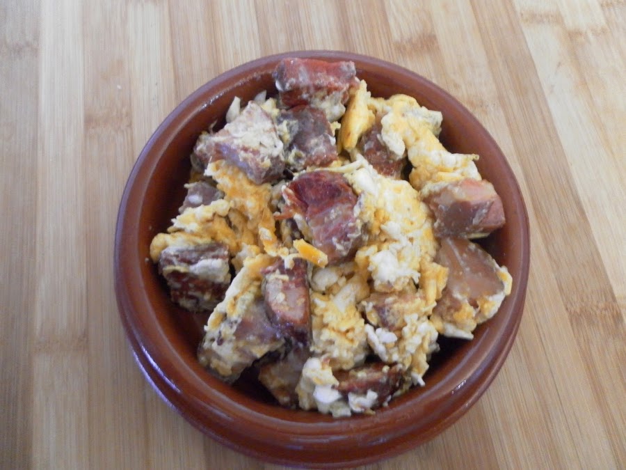 Ahora, cascamos los huevos y los vertemos encima de las carnes, sazonamos y removemos todo constantemente hasta que los huevos hallan cuajado, mezclando todo bien hasta hacer un revuelto al gusto.
